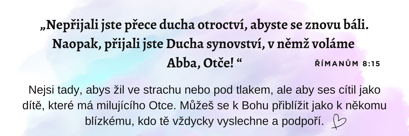Když mi Bůh poprvé řekl: „Dobrou noc, dcero moje“ Děkuji Bohu za služebníky, jako je Daniel Pech. Před zhruba třemi lety, když jsem ho poprvé slyšela kázat na YouTube, se ve mně něco probudilo. Jeho slova mě inspirovala, abych začala hledat Boha jako svého Otce. Pamatuji si, že ještě ten večer jsem klekla na kolena a modlila se: „Pane, prosím, zjev se mi jako Otec. Ukaž mi, jaký je opravdový vztah mezi otcem a dcerou. Nechci nic zkresleného.“ Často totiž nosíme v srdci zkreslený obraz Boha Otce – a to kvůli našim zkušenostem s pozemskými otci. Ten večer, uprostřed modlitby, jsem uslyšela Jeho hlas: „Dobrou noc, dcero moje.“ Zůstala jsem v naprostém úžasu. Šla jsem za manželem a řekla: „Víš, co mi právě řekl Bůh?“ Zopakovala jsem mu ta slova. Manžel se usmál: „To je normální, to běžně říkají tátové svým holčičkám.“ Jenže můj otec mi to nikdy neřekl. A už vůbec ne s takovou něhou a laskavostí. Bůh přesně věděl, co moje srdce potřebuje slyšet. Tak začal můj proces hlubokého uzdravení. Bůh mi nejprve ukázal neuzdravená místa v mém srdci a potom mi začal zjevovat, jaký opravdu je: milující, laskavý a nekonečně dobrý. Učil mě vidět Ho bez zkreslení – takového, jaký skutečně je. V Bibli se píše: „Především střež své srdce, vždyť z něho vychází život.“ (Přísloví 4,23) Poznala jsem, že dokud je srdce plné zranění, je těžké vidět Boha správně. Ale když Mu dovolíme vstoupit a uzdravovat, začnou proudit nové prameny života.