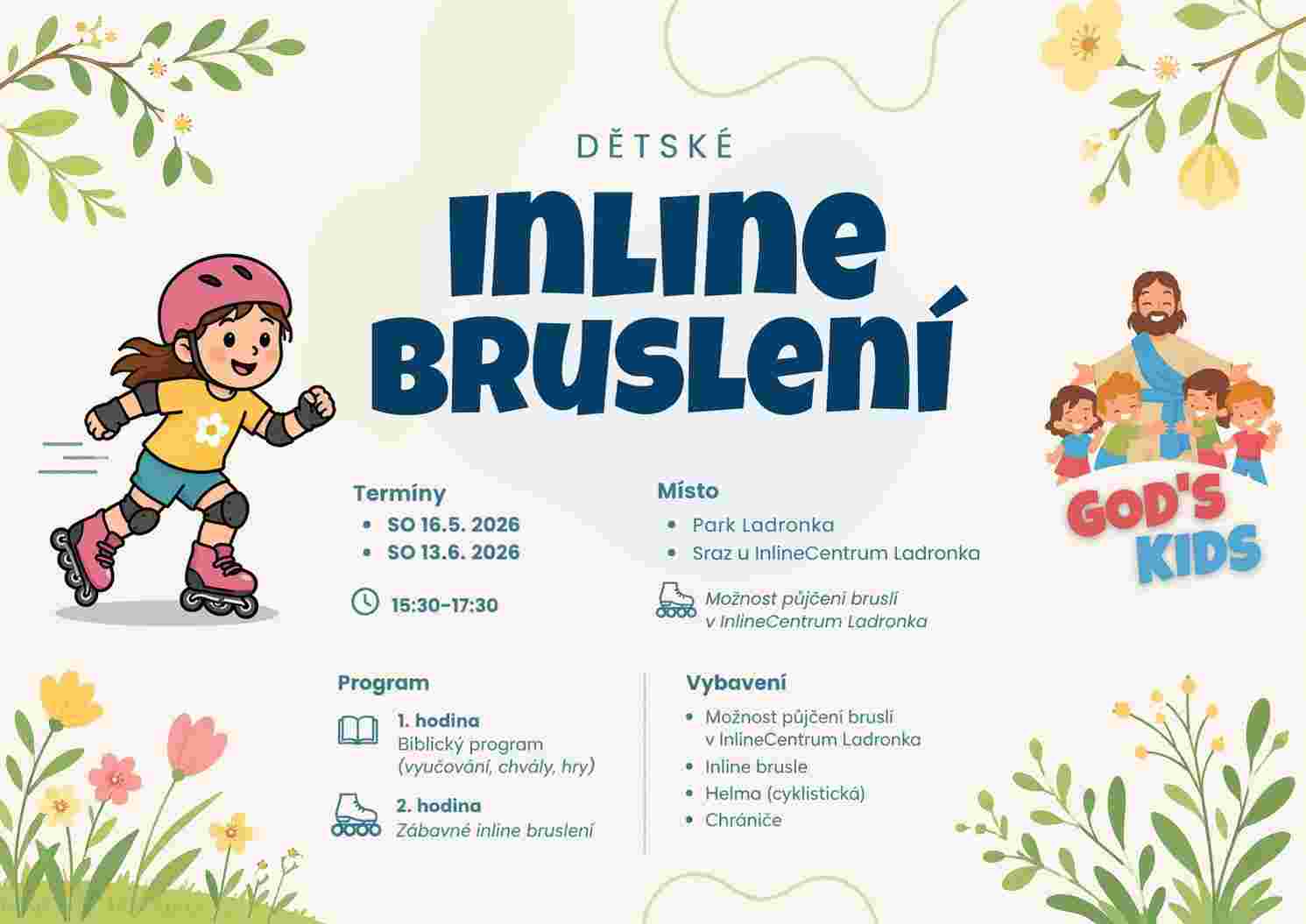 Přátelé, rádi bychom Vás pozvali na společné inline bruslení pro děti 🙂 Všechny informace najdete na letáčku. Sejdeme se v parku Ladronka v Praze u InlineCentra, kde je i možnost půjčení bruslí, takže se nemusíte bát, pokud vybavení nemáte. Program plánujeme rozdělit na dvě části – první hodinu společně strávíme biblickým programem (vyučování, chvály, hry) a druhou hodinu si užijeme zábavné inline bruslení 🙂 Začátečníci nejsou žádný problém, rádi pomůžeme každému se rozjezdit 🙂 Těšíme se na společný čas!