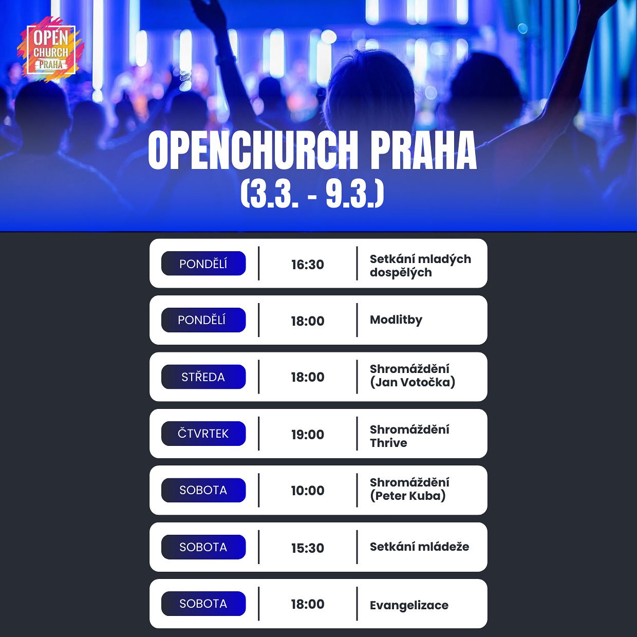 Týdenní program ve sboru 🤩 Zveme vás na bohatý týden plný společenství, modliteb a povzbuzení ve víře. Připojte se k nám na některé z našich setkání: 🔥 ✔️ Setkání mladých dospělých – Prostor pro sdílení, povzbuzení a společný růst ve víře. ✔️ Modlitby – spojme se v modlitbě za sbor, město i osobní potřeby. ✔️ Shromáždění s Janem Votočkem – Přijďte načerpat povzbuzení z Božího slova. ✔️ Shromáždění Thrive – Inspirativní večer plný chval, slova a povzbuzení. ✔️ Shromáždění s Petrem Kubou – slovo povzbuzení a společné uctívání. ✔️ Setkání mládeže – čas pro přátelství, diskuzi a duchovní růst. ✔️ Evangelizace – Sdílíme evangelium s lidmi kolem nás.