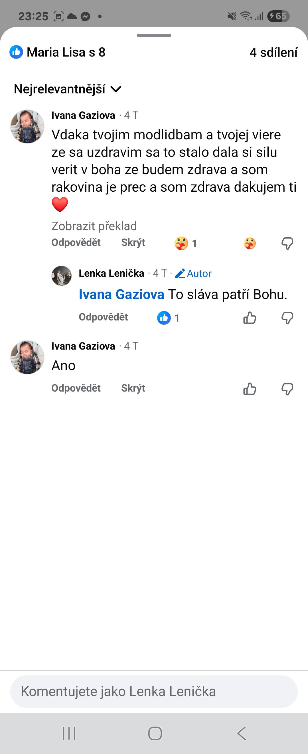 Svědectví, sláva Bohu, moje známá byla nemocná na rakovinu a ja se modlila za ni a Bůh se oslavil ,je uzdravena z rakoviny. Sláva Bohu