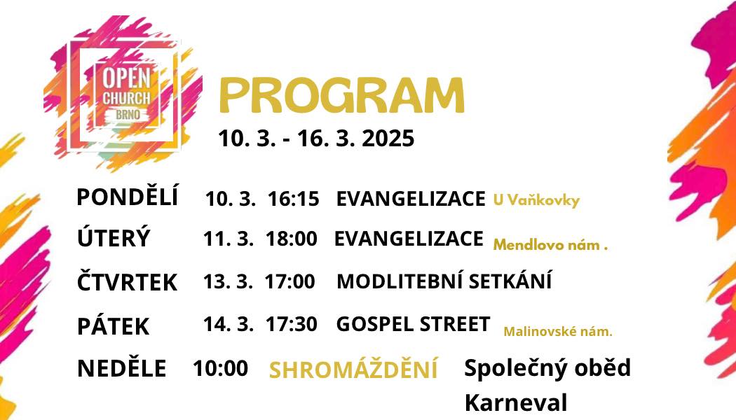 PROGRAM NA TENTO TÝDEN 🗓️ Pondělí - modlitby 🙏 Čtvrtek - setkání v kavárně ☕ Neděle - bohoslužba 🥳 Aaa? Kupa evangelizací. 🔥