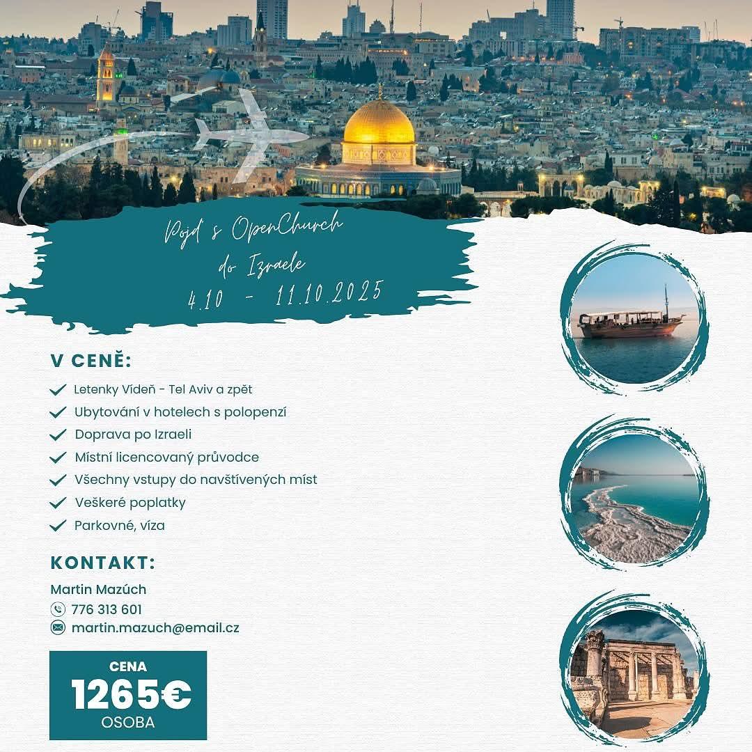 Pojď s námi do Izraele🇮🇱 ✔️Sobota 4. 10. – Přílet z Vídně do Tel Avivu – Od oběda: pláž v Netanii – Večer: život na promenádě v Netanii ✔️Neděle 5. 10. – Cesarea: místo mnoha biblických příběhů z Nového zákona – Hora Karmel: kde Eliáš svolal oheň z nebe – Megido: místo poslední celosvětové války – Armagedon – Přechod přes údolí Jizreel: místo bitvy z dob Baraka a prorokyně Debory – Har Kadumim: místo, kde chtěli shodit Ježíše ze srázu – Nazaret: město, kde Ježíš přežil většinu svého pozemského života ✔️Pondělí 6. 10. – Hora Arbel – Hora Blahoslavenství – Magdala: rodiště Marie Magdaleny – Termální lázně Hamat Gader ✔️Úterý 7. 10. – Plavba lodí po Galilejském jezeře – Tabgha: místo třetího zjevení Ježíše po vzkříšení – Kafarnaum: Ježíšovo město a centrum jeho 3,5leté služby – Gan HaShlosha: přírodní laguna u Gedeonových pramenů – koupání – Přesun do Jeruzaléma ✔️Středa 8. 10. – Staré město Jeruzalém – Zeď nářků – Údolí Kidron – Getsemanská zahrada – Olivová hora – Hroby Malachiáše, Zachariáše a Haggeuse – Místo nanebevstoupení Ježíše ✔️Čtvrtek 9. 10. – Davidsonovo muzeum – Davidovo město – Pochod za Jeruzalém ✔️Pátek 10. 10. – Mrtvé moře: koupání – Kumrán: místo nálezu biblických svitků – Ein Gedi: místo úkrytu Davida před Saulem – (Pokud stihneme) Wadi Kelt: stará cesta z Jeruzaléma do Jericha ✔️Sobota 11. 10. – Chrámová hora – Garden Tomb – Volný čas ve Starém Městě Jeruzalém – Odlet do Vídně