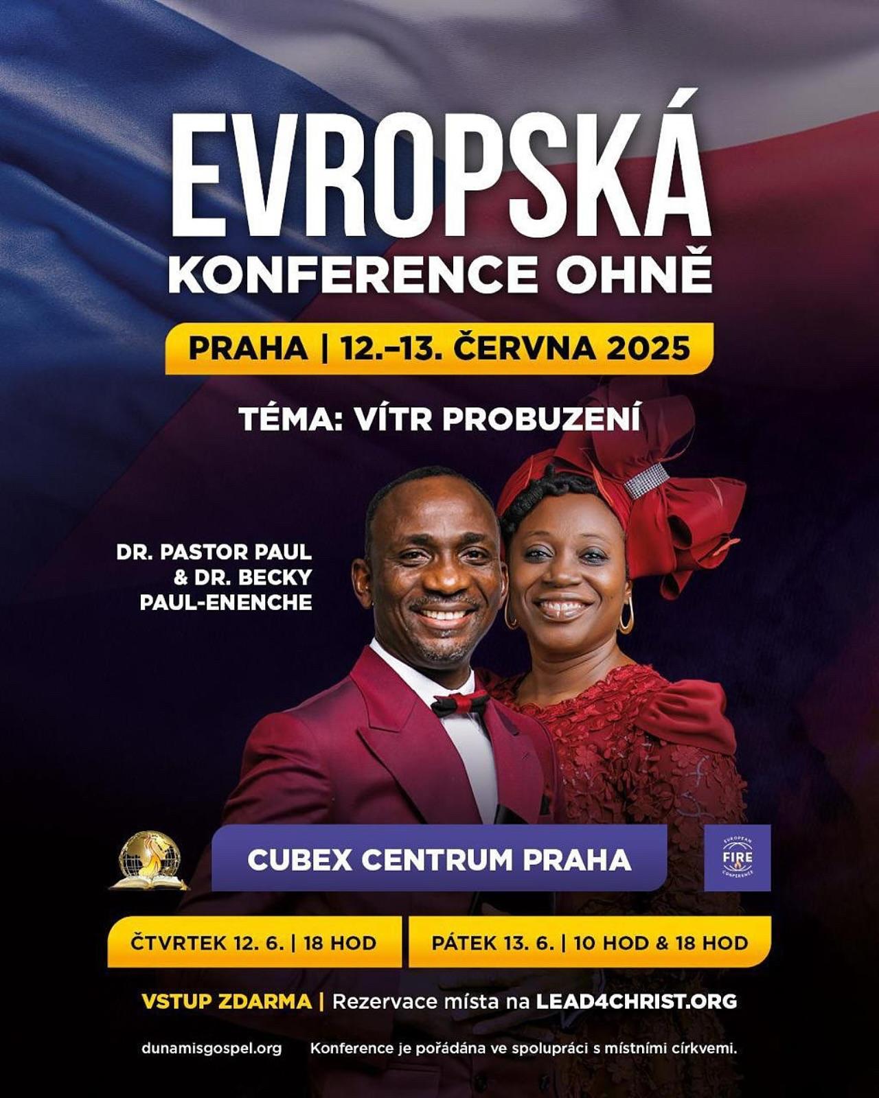 Zveme vás na výjimečnou konferenci s pastorem Dr. Paulem Enenche a jeho manželkou Dr. Becky Enenche! Přijďte zažít dny obnovení, povzbuzení a duchovního růstu pod vedením světově uznávaného kazatele, pastora Dr. Paula Enenche, staršího sboru Dunamis International Gospel Centre v Nigérii. Spolu s ním vystoupí i jeho manželka, mocná žena víry Dr. Becky Enenche. Těšit se můžete na skvělé slovo, modlitby za uzdravení a mocný čas v Boží přítomnosti. Tato konference je otevřená všem – ať už toužíte po novém začátku, hledáte směr nebo prostě chcete více z Boha. 📅 Datum: 12.6. - 13.6.2025 📍 Místo: Cubex Centrum Praha ⏰ Čas: čtvrtek od 18:00, pátek 10:00 a 18:00 🎟️ Vstup zdarma / Registrace nutná: lead4christ.org Nechte se proměnit a posílit! Tato příležitost je výjimečná – nenechte si ji ujít.